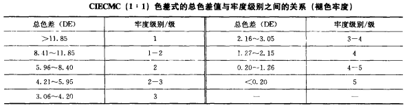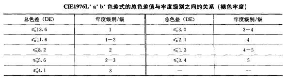 用測色儀器評價變褪色和沾色牢度是非常簡單和快捷的,已經得到了廣泛的應用。用色差儀進行染色紡織品牢度評級的過程如下:首先,對需要評價牢度的紡織品,按相關標準規定的條件對試樣進行處理。然后對處理前后的試樣用色差儀進行測色,并用選定的色差公式計算出處理前后的總色差。再根據選定的公式找到相應的表,根據計算的到總色差值,就可以找到對應的牢度級別。